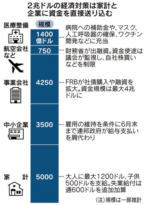 景気対策は国内総生産(GDP)の1割で「規模は過去最大だ」(トランプ大統領)。当初は1兆ドル案で着手したが、米経済は4~6月期に2桁のマイナス成長に転落するとの観測が強まる。財政支出の規模は一気に2倍になり、リーマン・ショック時(2008年)の7千億ドルを大きく超えた。