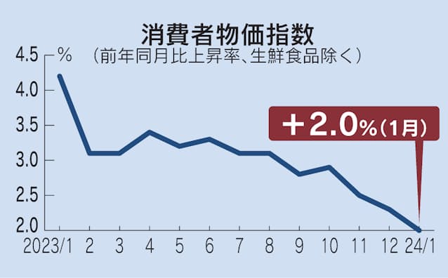 総務省が27日発表した1月の消費者物価指数(CPI、2020年=100)は変動の大きい生鮮食品を除く総合指数が106.4となり、前年同月比で2.0%上昇した。伸びは3カ月連続で縮小した。上昇率は22年3月の0.8%以来、1年10カ月ぶりの低水準だった。