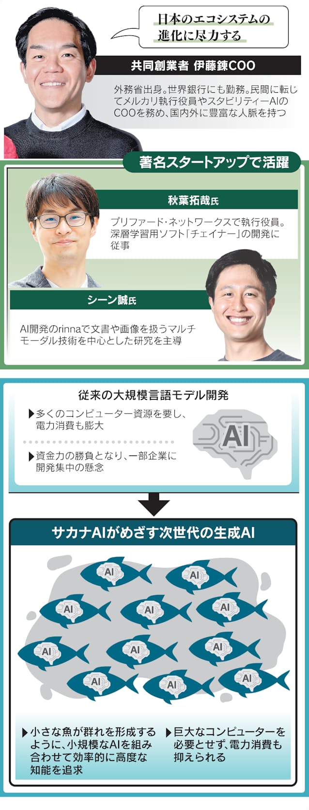 米グーグル出身の著名研究者らが日本で立ち上げた人工知能(AI)開発の新興企業、Sakana(サカナ)AI(東京・港)が本格始動した。創業から1年足らずで国内外から10人の異能が集い、企業価値は300億円規模に達した。米テクノロジー企業が主導する市場にゲームチェンジを仕掛ける。