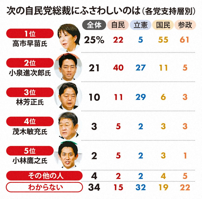 一方、自民支持層に限ると、小泉氏が40%で高市氏(22%)を大きく逆転。立憲支持層では、トップの林氏(29%)と2位の小泉氏(27%)が拮抗(きっこう)し、高市氏は5%で3位だった。国民民主、参政両党の支持層では、高市氏がそれぞれ55%、61%と他候補を圧倒。日本維新の会支持層は、小泉氏と高市氏がともに約3割で並んだ。