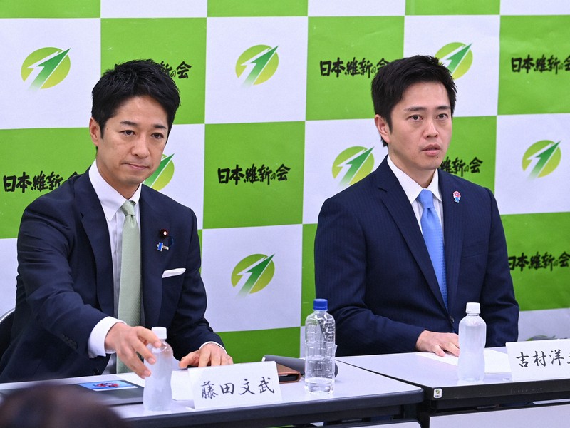 日本維新の会の吉村代表(左)と藤田共同代表(15日)