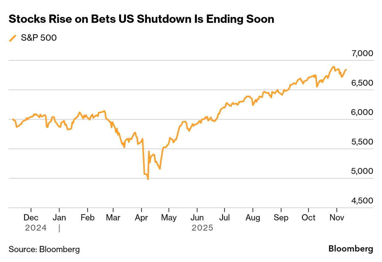 11日の米株式市場ではS&P500種株価指数が3日続伸。朝方は軟調だったが、米国史上最長の政府閉鎖がまもなく終結するとの見方が広がり、上げに転じた。政府統計の発表が再開すれば、連邦準備制度理事会(FRB)の今後の方針を見極める材料が得られるとの期待が高まっている。