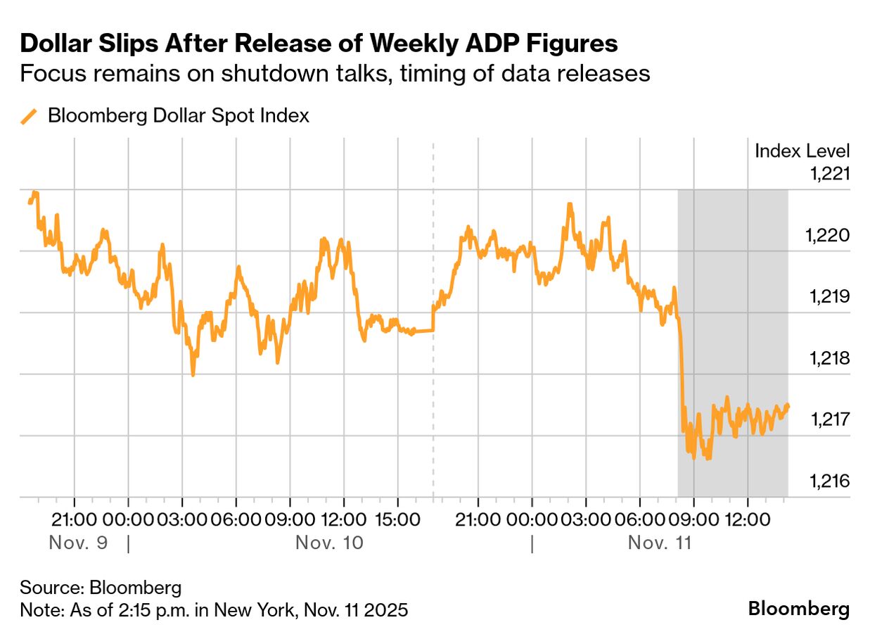 ADPリサーチが発表した週次の民間雇用者数は、10月後半の米労働市場が、前半に比べて減速したことを示唆した。政府閉鎖により政府統計の発表が遅れる中、市場関係者は民間のデータに頼らざるを得ない状況が続いている。