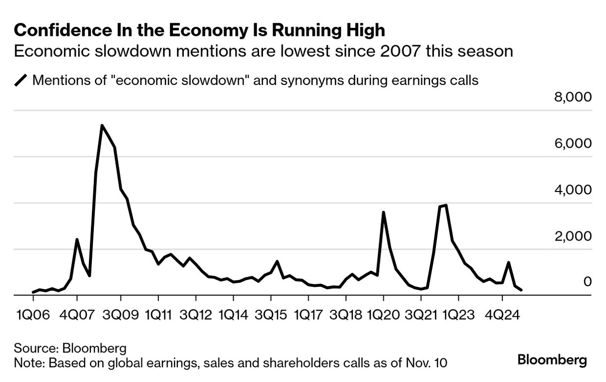米企業の直近の決算発表では、経営者が経済の先行きに驚くほど楽観的な見方を示している。ブルームバーグの集計によると、「景気減速」といった表現が決算説明会などで言及された回数は、2007年以来の低水準となっている。政府機関閉鎖により経済指標の発表が滞り、政策の先行きが一段と不透明になっているにもかかわらずだ。一方でS&P500種は年間ベースで3年連続の上昇に向かっており、割高感は強まっている。