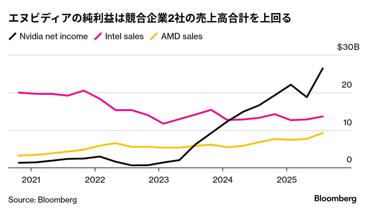 今回の四半期業績が市場予想とどう比較されるかにかかわらず、エヌビディアにとっては驚異的な成長の証しとなる。売上高は3年前の同四半期から約10倍に拡大する見通し。通期の純利益はインテルとアドバンスト・マイクロ・デバイセズ(AMD)の売上高を合わせた額を上回る勢いだ。