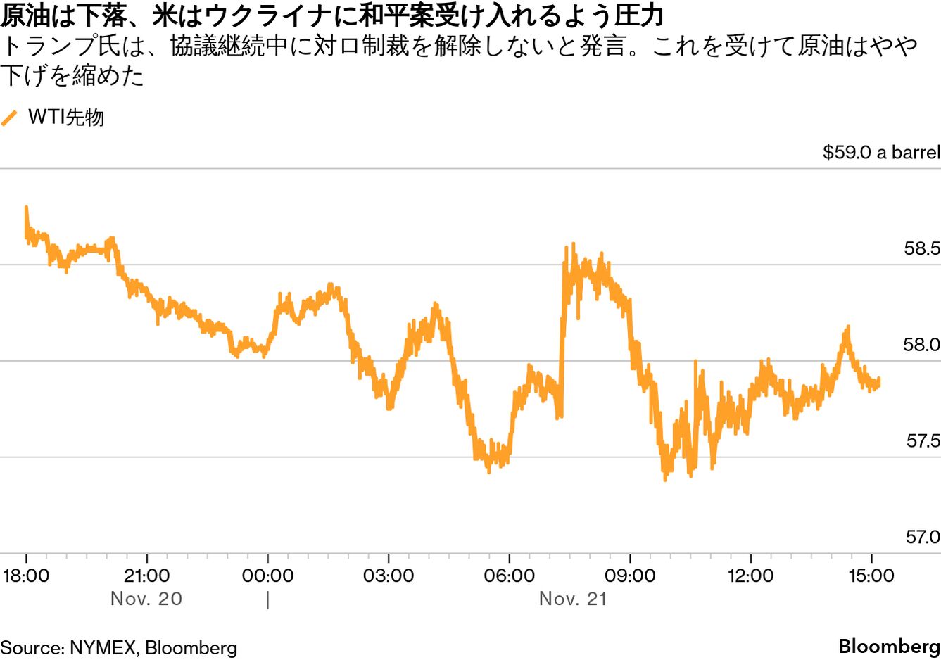 トランプ大統領は、協議継続中もロシアに対する制裁を解除しないと発言。これを受けて原油は下げを縮めた。ロシアの2大石油会社に対する制裁は21日に発効した。