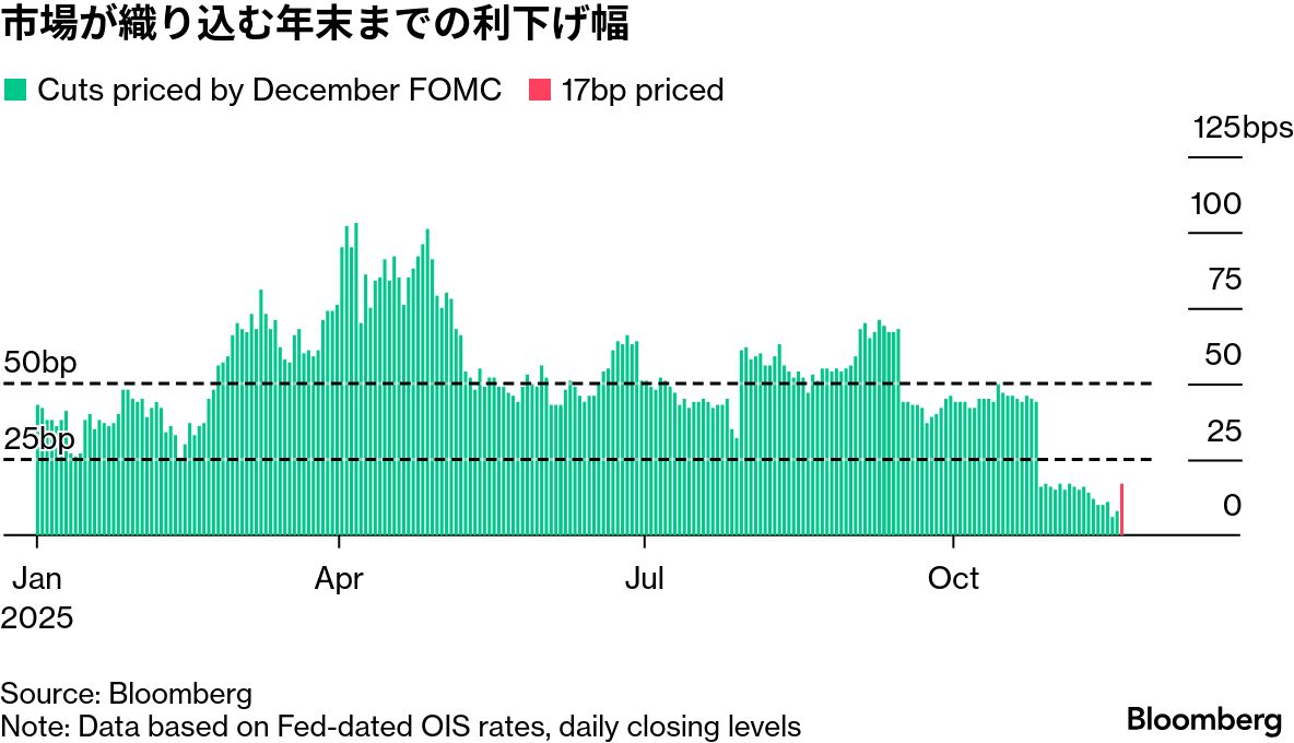 金利先物市場の動向によると、ウィリアムズ総裁の発言を受けて12月9、10日の連邦公開市場委員会(FOMC)会合での利下げの確率は約70%に上昇。発言前は約35%だった。