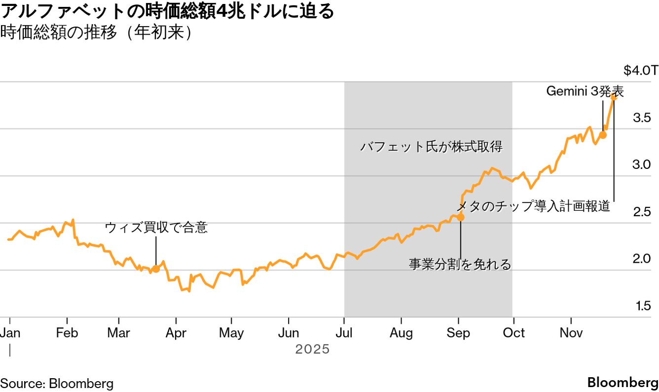 著名投資家ウォーレン・バフェット氏の投資会社バークシャー・ハサウェイが49億ドル(約7600億円)相当の株式を取得したことも追い風となり、アルファベット株価は騰勢を強めている。10月中旬以降の上昇で時価総額はおよそ1兆ドル増加。25日の取引では一時3.2%上昇し、初の時価総額4兆ドル到達に近づいた。