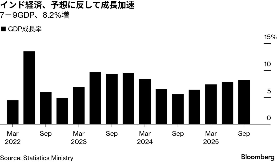 インドの7-9月(第3四半期)経済成長率は6四半期ぶりの高水準となった。トランプ米大統領による大幅な関税措置で見通しが曇る中でも底堅さを示した。