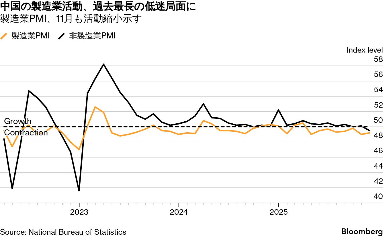 国家統計局の30日の発表によると、11月の製造業購買担当者指数(PMI)は49.2となり、景気の拡大・縮小の分かれ目である50を8カ月連続で下回った。ブルームバーグが調査したエコノミスト予想の中央値は49.4だった。