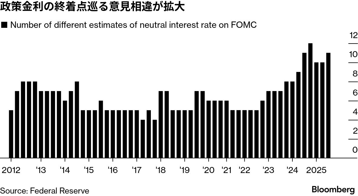 FRBの金利見通しでは過去1年ほどの間に、2012年の予測公表開始以降で最大の乖離(かいり)が見られる。こうした状況が、来週の追加利下げの是非や、その後の政策運営を巡る異例の見解対立につながっている。