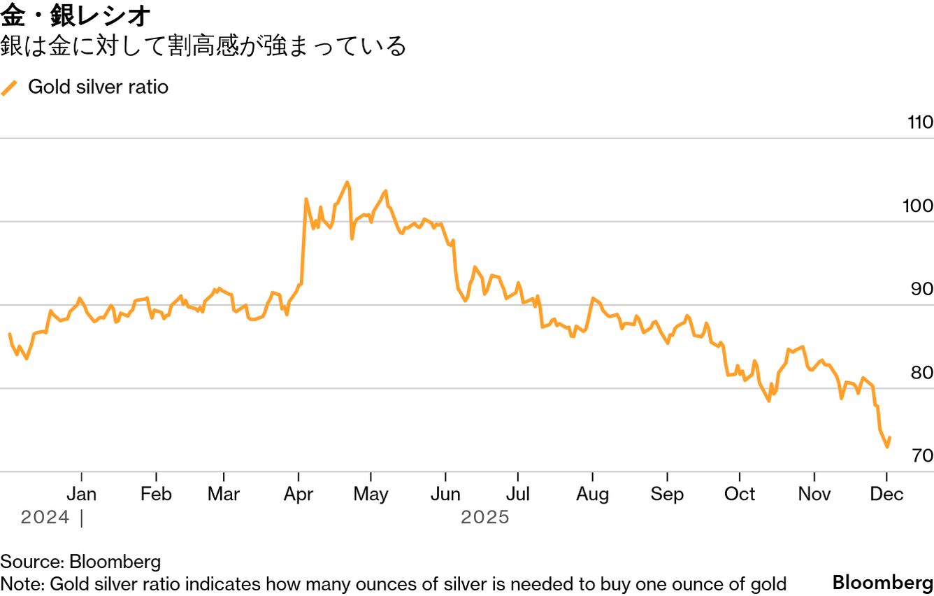 金1オンスを買うのに何オンスの銀が必要かを示す金・銀レシオはおよそ1年ぶりの水準に低下し、最近の銀の上昇が行き過ぎである可能性を示した。