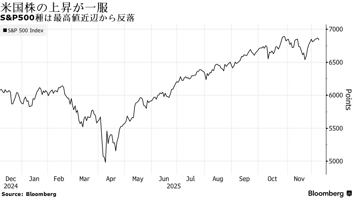 前週末に最高値に迫っていたS&P500種は0.3%安。2026年の利下げペースを巡る不透明感や、人工知能(AI)ブームの持続可能性に対する警戒感が投資家心理を冷やした。米国株はここ数週間、一部のFRB当局者が今週、3会合連続の利下げを実施する意向を示唆したことを好感して持ち直し基調にあった。