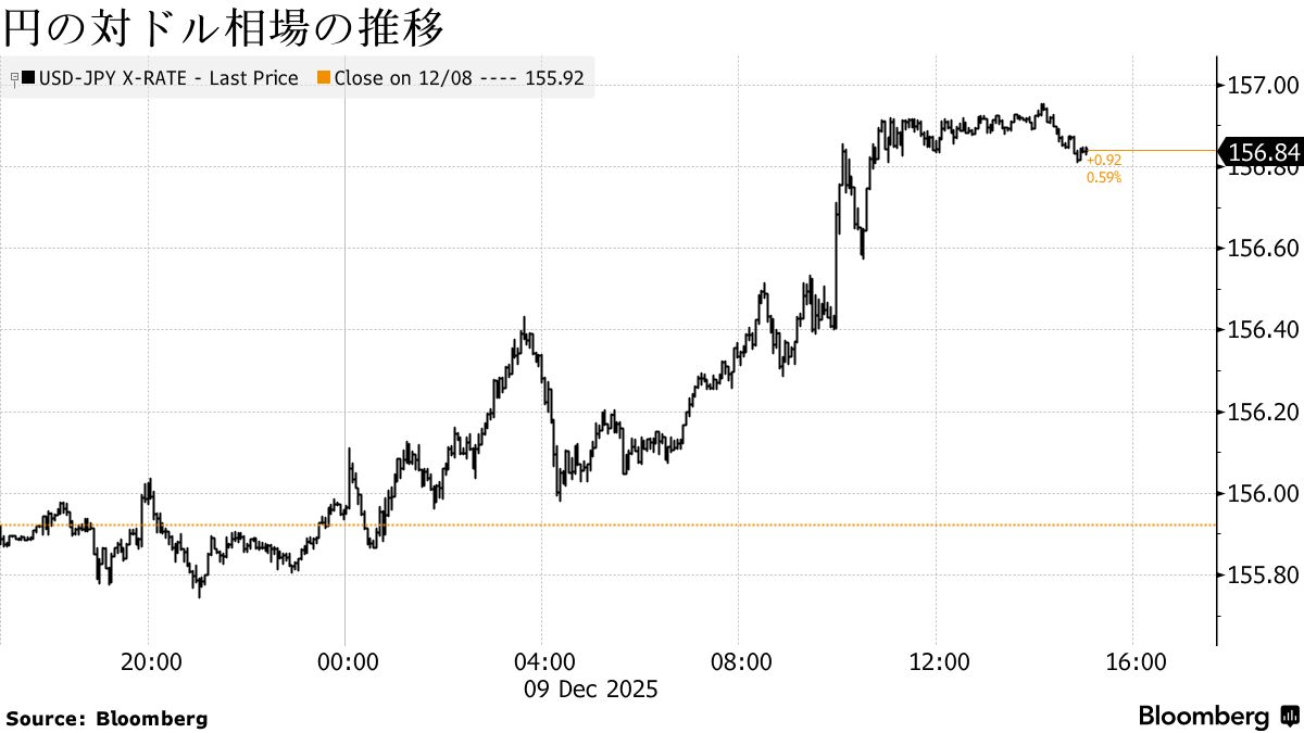 市場が日本銀行の利上げ見通しを引き続き探るなか、円は主要通貨の中で下げが目立った。円は対ドルでじりじりと水準を切り下げる展開。一時は0.7%安の156円95銭と、11月25日以来の安値をつけた。