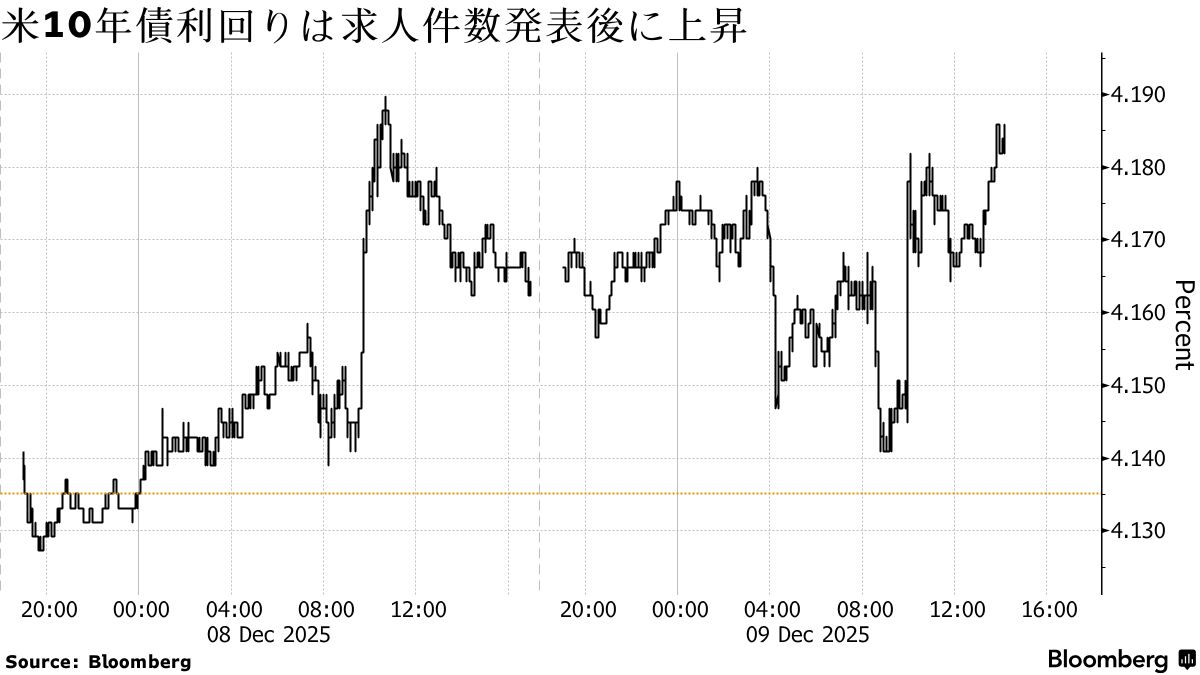 9日の米金融市場では、債券が下落(利回りは上昇)。米求人件数が予想を上回り、景気が底堅さを示す中で米連邦準備制度理事会(FRB)が追加利下げの是非を判断するという課題が改めて浮き彫りになった。