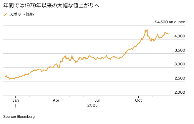 10月下旬に1オンス=4380ドル超の過去最高値を付けた後はいくぶん軟化したものの、米追加利下げが続くとの見方が下支えとなっている。パシフィック・インベストメント・マネジメント(PIMCO)は、各中銀が米国債より多くの金を保有していることから、金は今後も堅調に推移すると見込んでいる。