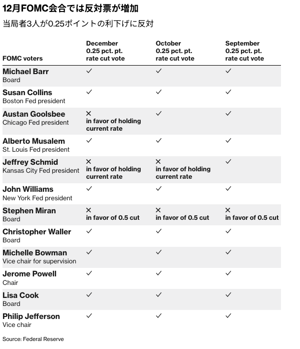 ▽FOMCが0.25ポイント利下げ、3人が反対票-26年は利下げ1回を予想<bloomberg日本語版>2025年12月11日 at 4:13 JST