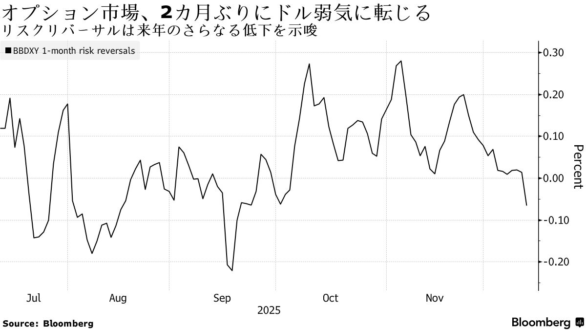ブルームバーグ・ドル・スポット指数の1カ月物リスクリバーサルは0.06%のプットオーバーと、10月初旬以来初めてマイナス圏に沈んだ。11月末時点では0.08%のコールオーバーだった。
