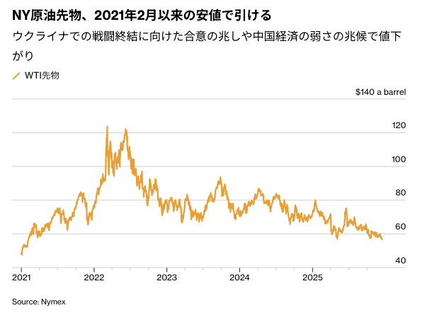 クリスマスや年末年始を控える中、この日の原油市場は薄商いとなった。ウクライナと米国の代表団による協議では、米国側がウクライナに対してより中身のある安全保障案を提示したが、その取り組みは、領土問題でゼレンスキー大統領に圧力をかける狙いの一環とも受け止められている。戦闘終結の合意が成立すれば、ロシア産原油の取引に対する制限が解除され、既に十分な供給がある市場でさらなる混乱の抑制につながり得る。