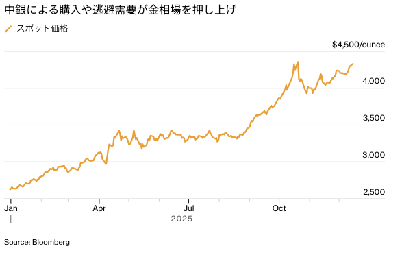 リナ・トーマス氏らゴールドマン・サックス・グループのアナリストは「米金融緩和局面では民間投資家の資金流入に加え、中央銀行による買いが続くとみており、金価格は2026年末までに4900ドルへ上昇すると予想している」とリポートで指摘。中銀による積極的な買い増しは、「複数年にわたるトレンド」だとし、26年の月間平均購入量は70トンとの予測を改めて示した。