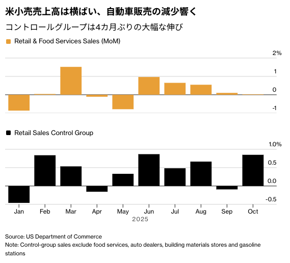 自動車とガソリンを除いた小売売上高は0.5%増加した。10月の小売売上高は当初11月14日の発表予定だったが、政府機関の閉鎖で公表が遅れた。