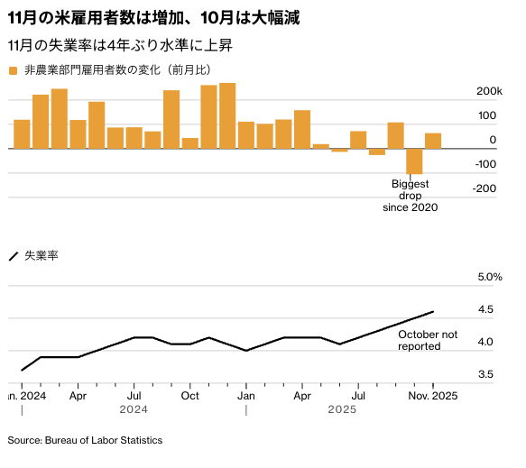 10月および11月の雇用者数の増減は、ここ数カ月における労働市場の不安定さを改めて浮き彫りにした。ただ失業率は上昇基調が続き、多くの失業者が新たな職を得るのに苦慮している状況が示された。今回の統計には留意すべき点もあるが、来年の金利見通しを巡る投資家の期待形成に影響を与えそうだ。