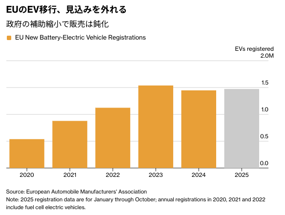 ドイツを含む欧州諸国では購入補助を取り下げたこともあり、EV新車販売が昨年鈍化していた。一部の国では補助を再開するなどで持ち直しつつあるが、販売ペースはEUの目標達成に必要な水準を引き続き大きく下回っている。