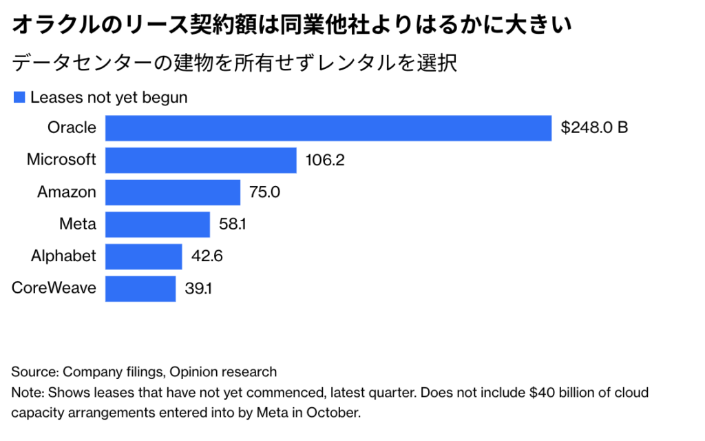 テック投資家はAIインフラ投資を拡大する企業にうんざりするほど慣れつつあるが、オラクルの将来のリース料へのエクスポージャーは、同業他社をはるかに上回る。