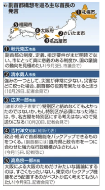 福岡市の高島宗一郎市長は10月の記者会見で「(東京と)同時被災のリスクが最も小さい大都市は福岡。首都のバックアップ機能として、まさに適地だ」と意欲を示した。さいたま市の清水勇人市長も同月、「副首都の定義によって判断をしていくことになるが、さいたま市は災害が非常に少ない。災害に絞れば、当然副首都としての役割を果たせる」と語った。