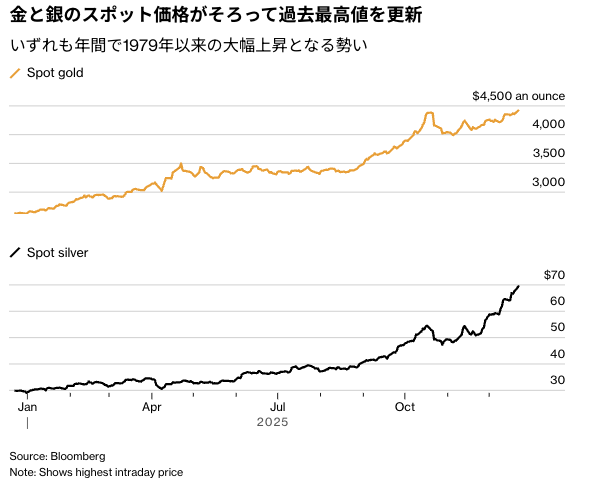 金のスポット価格は2%余り上昇し、10月に付けたこれまでの最高値1オンス=4381ドル強を上回った。貴金属は歴史的な1年の締めくくりを迎えつつあり、金と銀はいずれも1979年以来で最大の年間上昇率となる勢いだ。