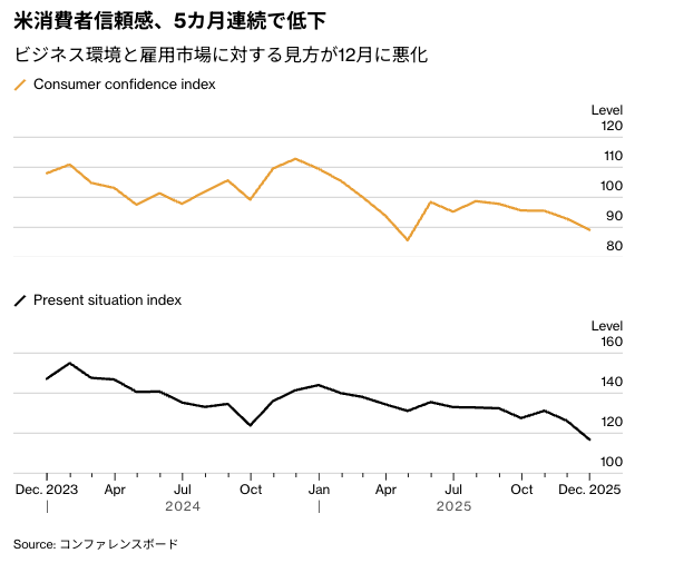 ブルームバーグ・エコノミクスのイライザ・ウィンガー氏は「雇用の機会に対する消費者の見方は12月に悪化し、同時に将来の労働市場に対する見方も弱くなった。労働市場の健全性がいかに米金融政策を左右するかを考慮すると、来年はより多くの利下げがあると予想される」と述べた。