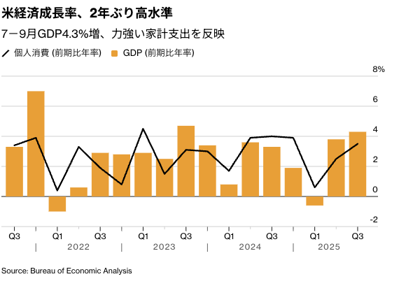 米経済は7-9月(第3四半期)に2年ぶりの高い成長率を記録した。底堅い個人消費や企業設備投資に加え、貿易政策の落ち着きが寄与した。