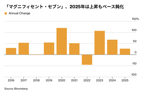 インベスコのブライアン・レビット氏は「投資家は『マグニフィセント・セブン』を一体の存在として捉え、常に同じ動きをし、市場全体の成否がその主導力にかかっていると考えがちだ」としつつ、「主要指数に占めるウエートが極めて大きいことを考えれば理解できる見方だが、現実を単純化し過ぎている」と付け加えた。