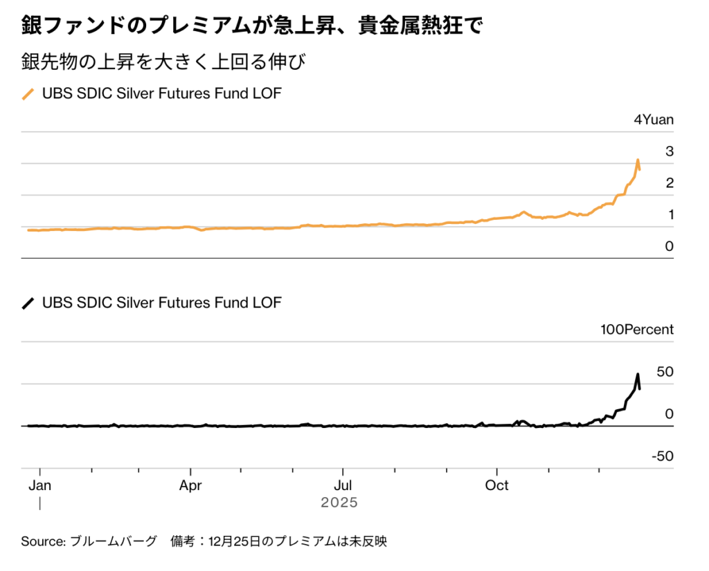 銀ファンドは今年に入り、220%近く上昇しており、上海銀先物の128%を大きく上回る伸びとなっている。24日の時点で原資産に対するプレミアムは62%に近く、月初の7%から大きく拡大していた。