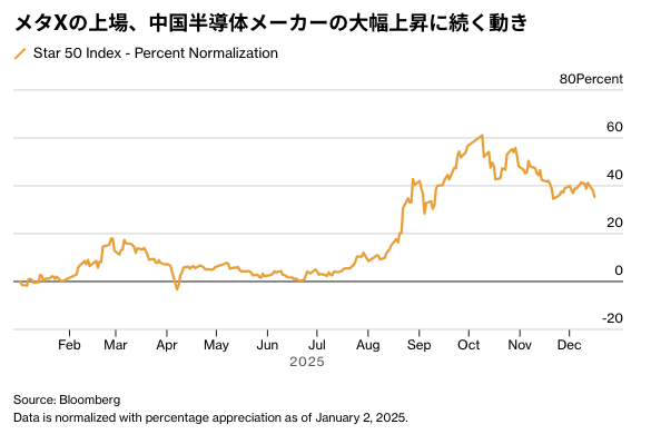 5日に上海に上場した摩爾線程は、初日に株価が一時500%を超える上昇となった。17日には、「中国のエヌビディア」と称される沐曦集成電路(メタX)が上場し、株価は初日に一時755%急騰した。