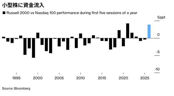 2026年の最初の数営業日では、上昇銘柄の裾野が大きく広がる展開となっている。大型テクノロジー株の支配力が緩み、通常は景気拡大局面で買われやすい業種が先行して上昇した。こうした動きは、異例ともいえるほど大きなローテーションとなっている。ラッセル2000は2026年の最初の5営業日でナスダック100指数を上昇率で約4ポイント上回り、年初としては過去2番目の好パフォーマンスとなっている。
