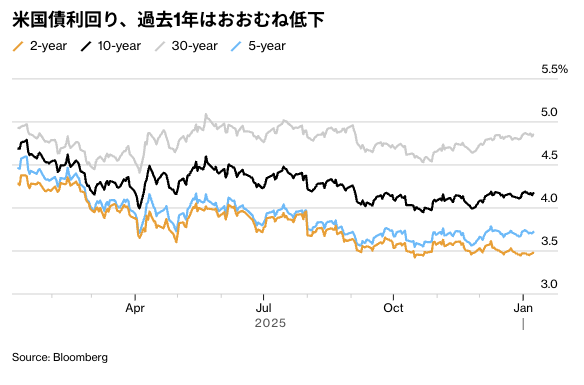 米国債相場は下落。9日に発表される12月の雇用統計や、米財政の改善に寄与してきた関税を最高裁が無効と判断する可能性を見据える動きが広がった。