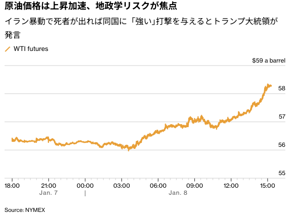 トランプ米大統領はデモが拡大するイランに触れ、政府がデモ隊を殺害すれば「強力な」打撃を同国に与えると脅した。原油市場は供給超過を想定していたため、イラン産原油の供給が途絶えれば予想外のハードルとなり得る。