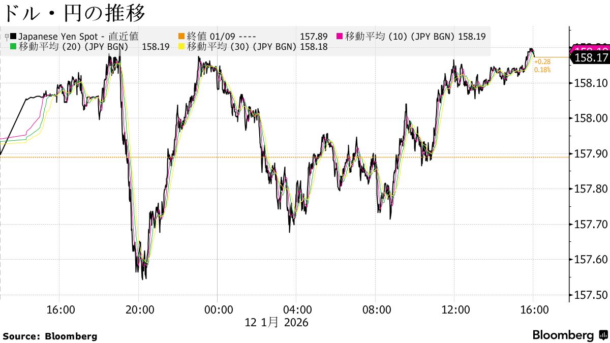 円は対ドルで値下がりし、158円台前半。一時は上昇する場面もあったが、高市早苗首相が衆院解散に踏み切るとの観測が強まっており、円の重しになっている。