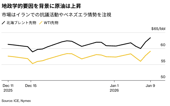 ウェスト・テキサス・インターミディエート(WTI)は8、9両日に計5%余り上昇していた。トランプ氏は核開発プログラムを巡り、イランが米国との交渉開始を提案してきたと述べた。一方で、デモ隊に対するイラン政府の対応を理由に、同国に対する軍事攻撃を承認する方向に傾いていると、WSJは事情に詳しい米当局者の話として伝えた。