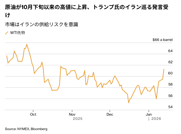 ウェスト・テキサス・インターミディエート(WTI)先物は1バレル=61ドル台で引け、約2カ月ぶりの高値。トランプ氏はデトロイトで記者団に対し、米国民がイランから退避するのは「良い考えだ」と発言。イランのデモ参加者に対して「支援が向かっている」とも述べた。