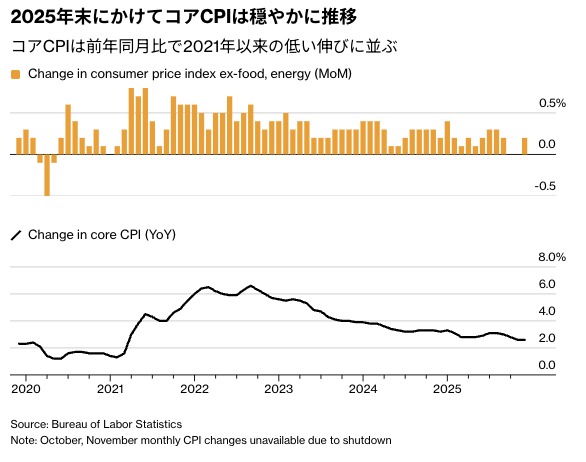 昨年12月の米消費者物価指数(CPI)統計で、変動の大きい食品とエネルギーを除くコア指数の伸びは市場予想を下回った。前回の統計は政府機関の一時閉鎖に伴うゆがみで判断が難しい部分があったが、物価上昇圧力の鈍化をより確かな形で示す内容となり、年内利下げ観測が強まった。