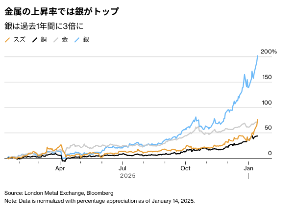 中国で複数種の金属に大量の買いが入り相場上昇をあおっているほか、ベネズエラやイランなどの地政学的緊張、トランプ政権による米連邦準備制度理事会(FRB)への攻撃を背景に、安全資産を求める動きが続いている。