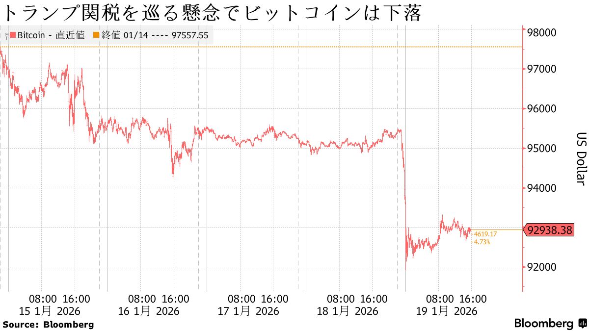 19日の暗号資産(仮想通貨)ビットコインは大幅下落。トランプ米大統領が欧州8カ国を対象に新たな関税措置を表明したことを受け、リスク資産が売られ、安全資産需要が高まった。