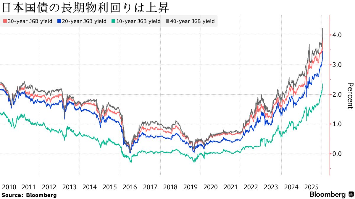 日本国債の30年物および40年物利回りはそれぞれ25ベーシスポイント(bp、1bp=0.01%)余り上昇し、トランプ米大統領が広範な関税を発表して世界の市場を混乱させた昨年4月以来の大幅上昇を記録した。