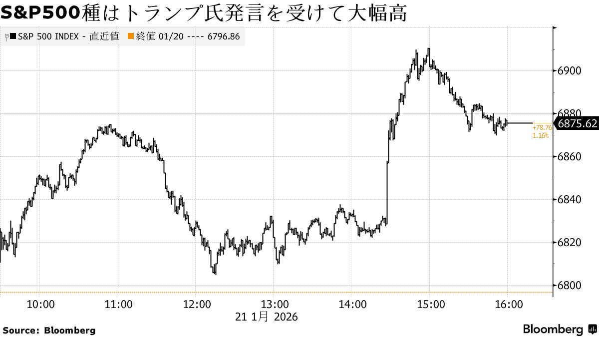 21日の米株式相場は反発。朝方からプラス圏で推移していたが、トランプ米大統領がグリーンランドを巡る欧州諸国への関税措置を見送ると表明した後、上げ幅が一時急拡大した。S&P500種株価指数は終値ベースで、昨年11月以来の大幅高となった。