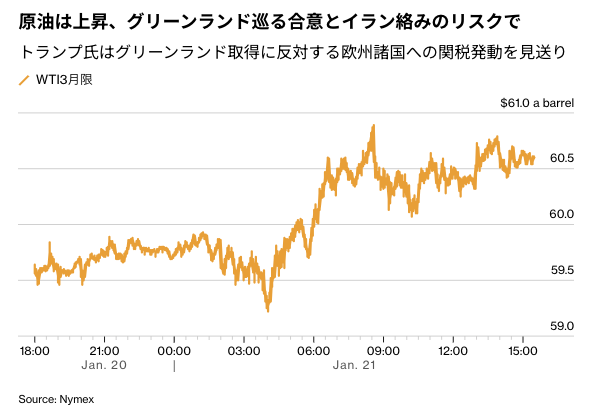 原油先物相場は小幅続伸。トランプ大統領がグリーンランドの将来を巡るディール枠組みに到達したとし、2月1日に発動を予定していた欧州諸国への関税を見送る考えを示したことが材料視された。