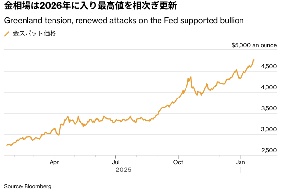 金は過去12カ月に約75%値上がり。トランプ政権がグリーンランド取得を目指し、北大西洋条約機構(NATO)加盟国への圧力を強めていることで金融市場に衝撃が走っており、金の高騰に拍車がかかった。各国中央銀行による購入や逃避買い需要に加え、米金融政策が緩和方向にあることも利息を生まない金の追い風になっている。