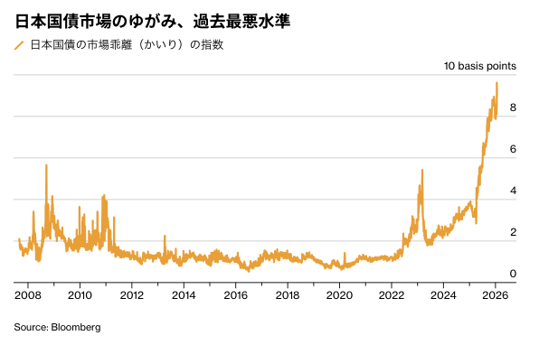 日本国債利回りが理論値からどれだけ乖離(かいり)しているかを測るブルームバーグの指数は今週、過去最高に上昇し、市場のゆがみが深刻化していることを示した。