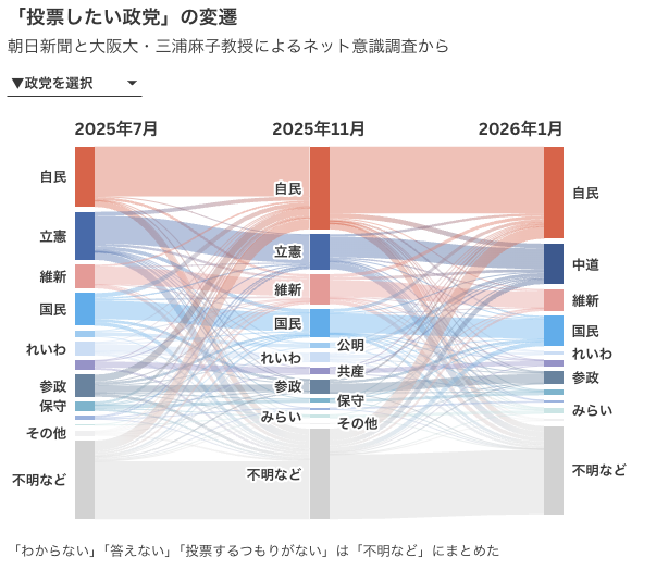 ▽投票先、自民伸び29% 中道はちょうど立憲+公明分 朝日阪大調査<朝日新聞デジタル>2026年1月26日 7時00分